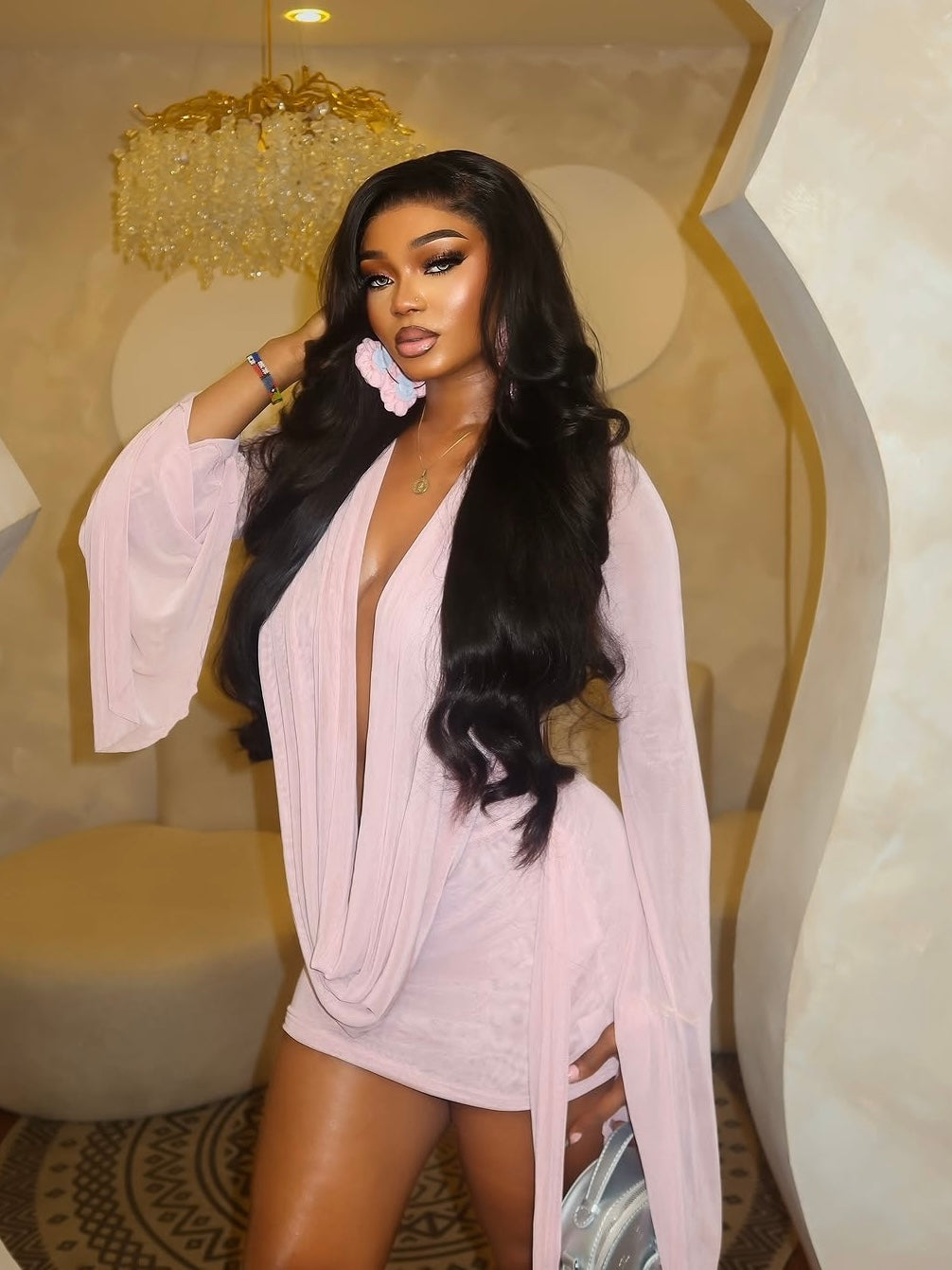 This soft pink mini dress is designed to flatter, seduce, and shine. Featuring a deep plunge neckline with an elegant draped front and flowy long sleeves, it hugs the body while creating a romantic, ultra-feminine silhouette. The lightweight, sheer finish adds just the right touch of allure—perfect for birthday celebrations, date nights, and elevated night-out looks.