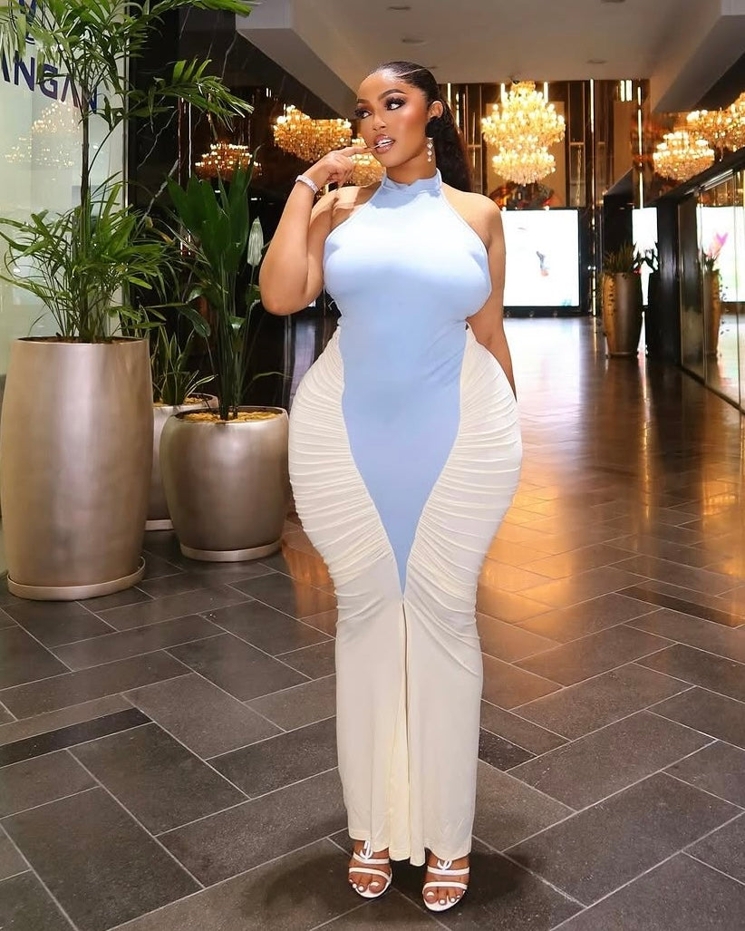 Step into effortless elegance with the cannes Maxi Dress. Designed with a sleek halter neckline and a sculpting, curve-enhancing fit, this maxi features soft ruched detailing and a striking two-tone contrast that elongates the silhouette. The blend of serene blue and creamy ivory creates a fresh, sophisticated finish—perfect for birthday dinners, brunch dates, and elevated evening occasions.