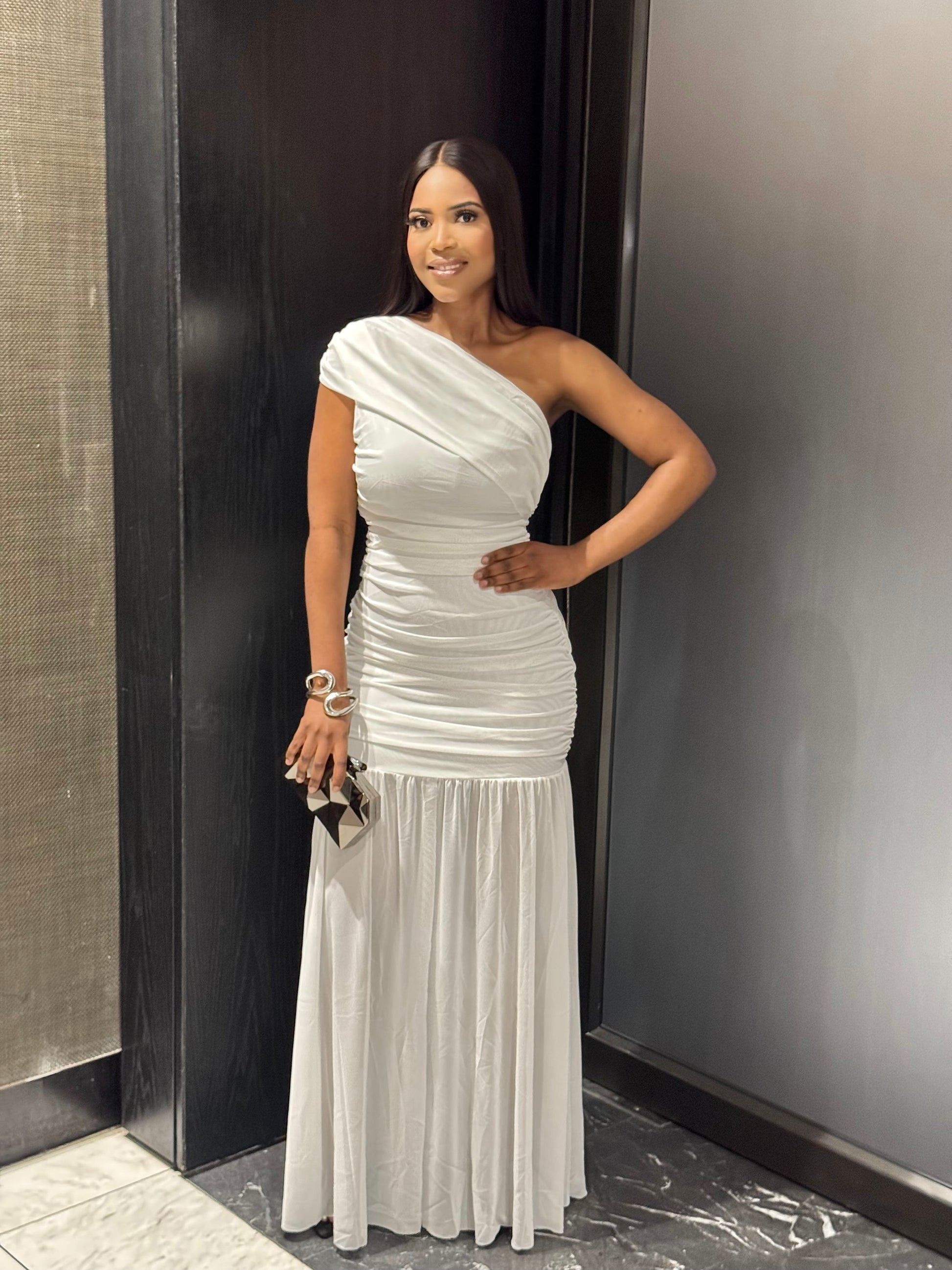 Embrace timeless elegance in the Liora Maxi Dress. With its one-shoulder neckline, ruched bodice, and flowing chiffon skirt, this ivory gown is the perfect blend of sophistication and romance. Ideal for weddings, formal dinners, or unforgettable evening occasions.