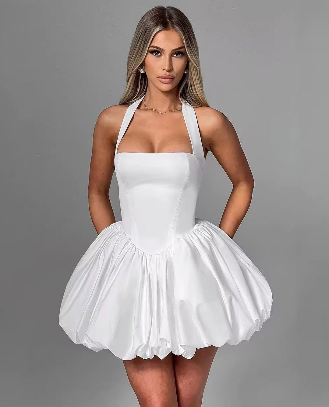 where elegance meets modern allure. Designed with a sculpting corset-style bodice and a flattering halter neckline, this dress cinches the waist while the voluminous bubble skirt adds a playful yet sophisticated finish. Crafted in a soft ivory tone, it’s the perfect statement piece for birthdays, bridal moments, cocktail events, and unforgettable nights out.