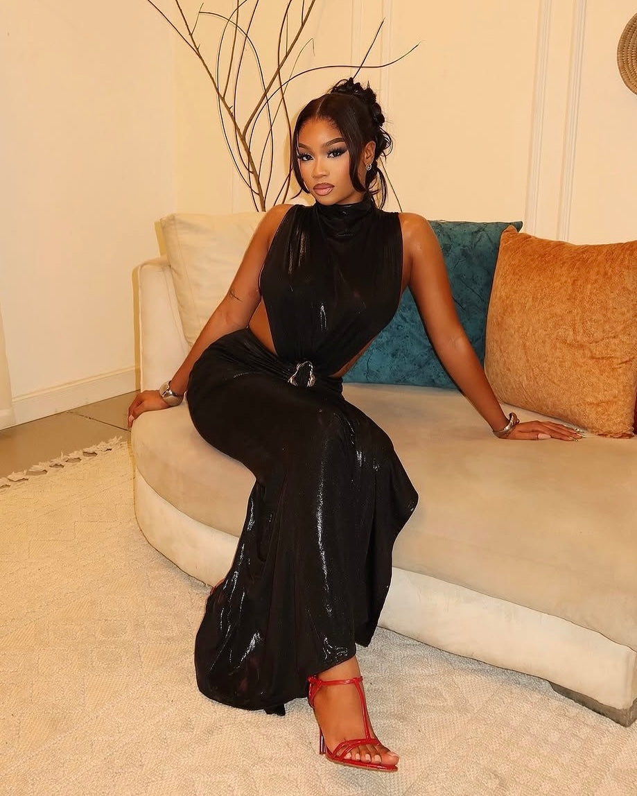 Own the night in the Noir Metallic Cutout Maxi Dress. With sultry waist cut-outs, a crystal buckle accent, and a glossy black finish, this statement piece is made for glamorous evenings and unforgettable moments.