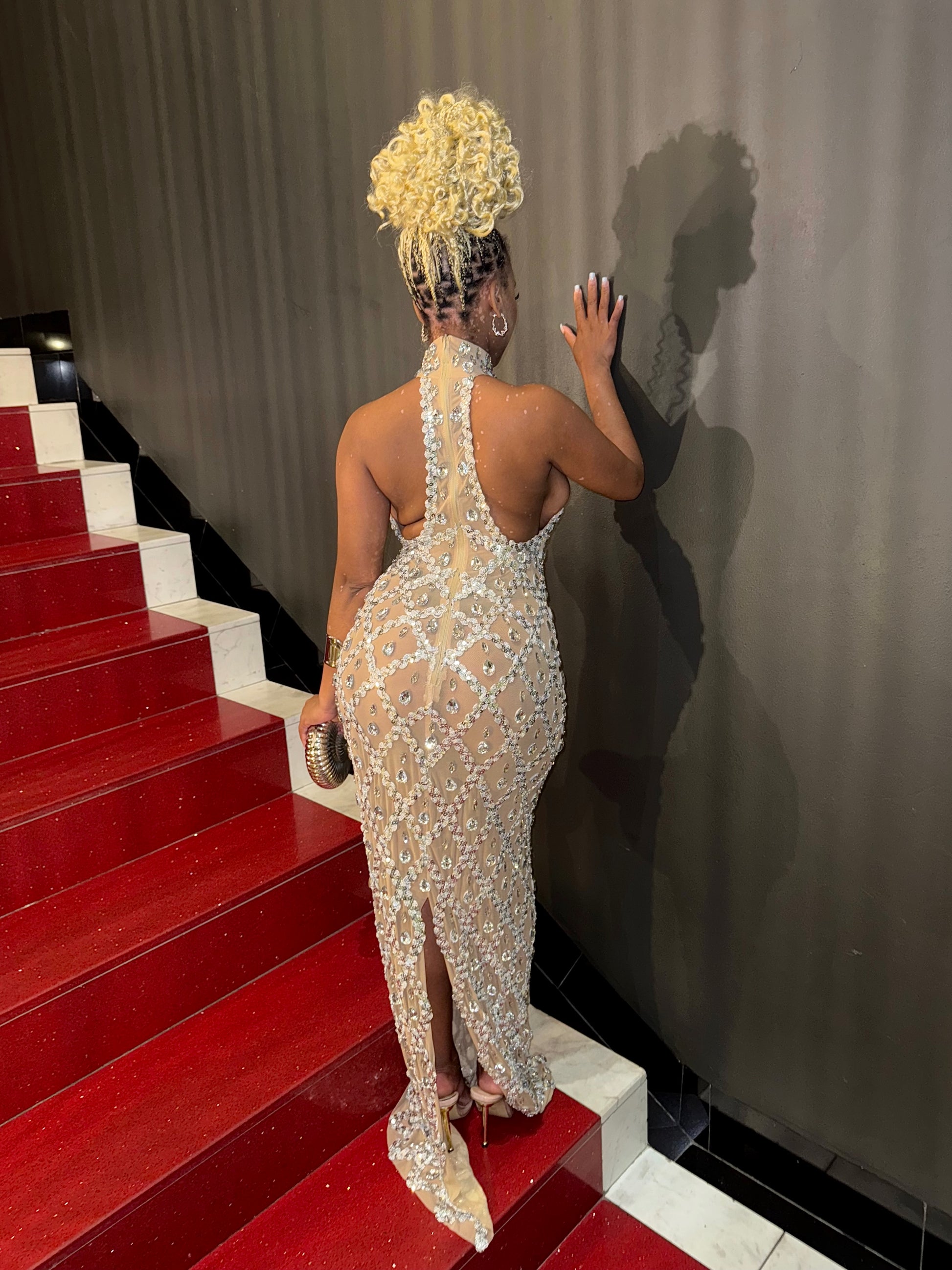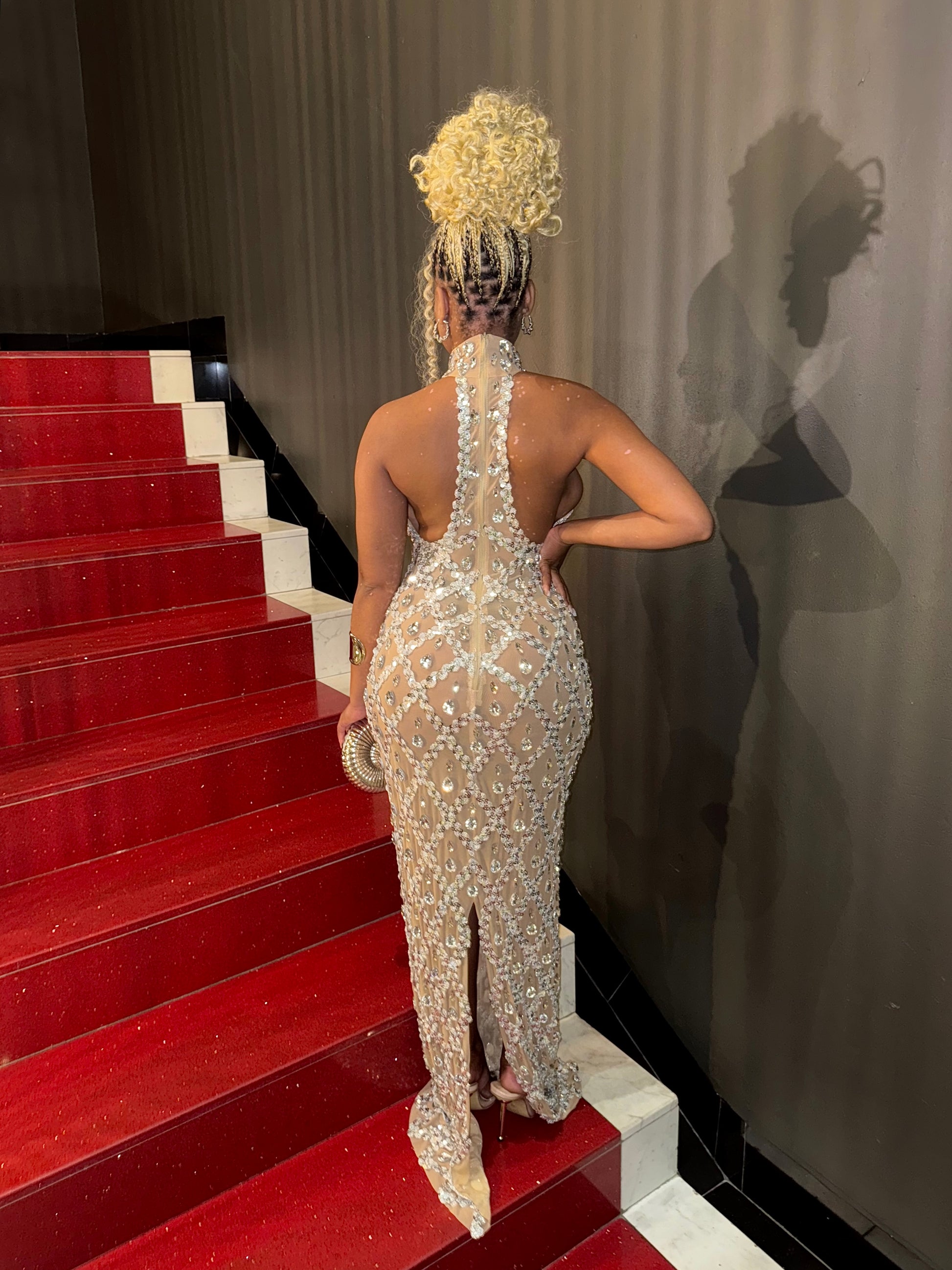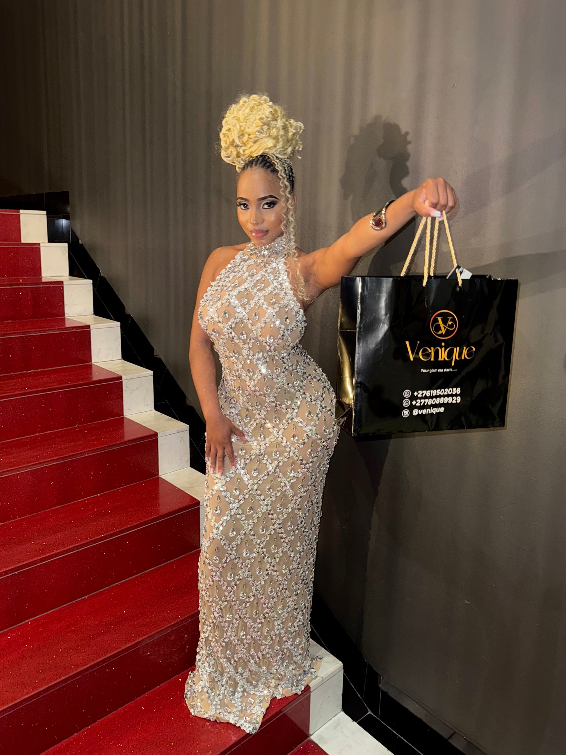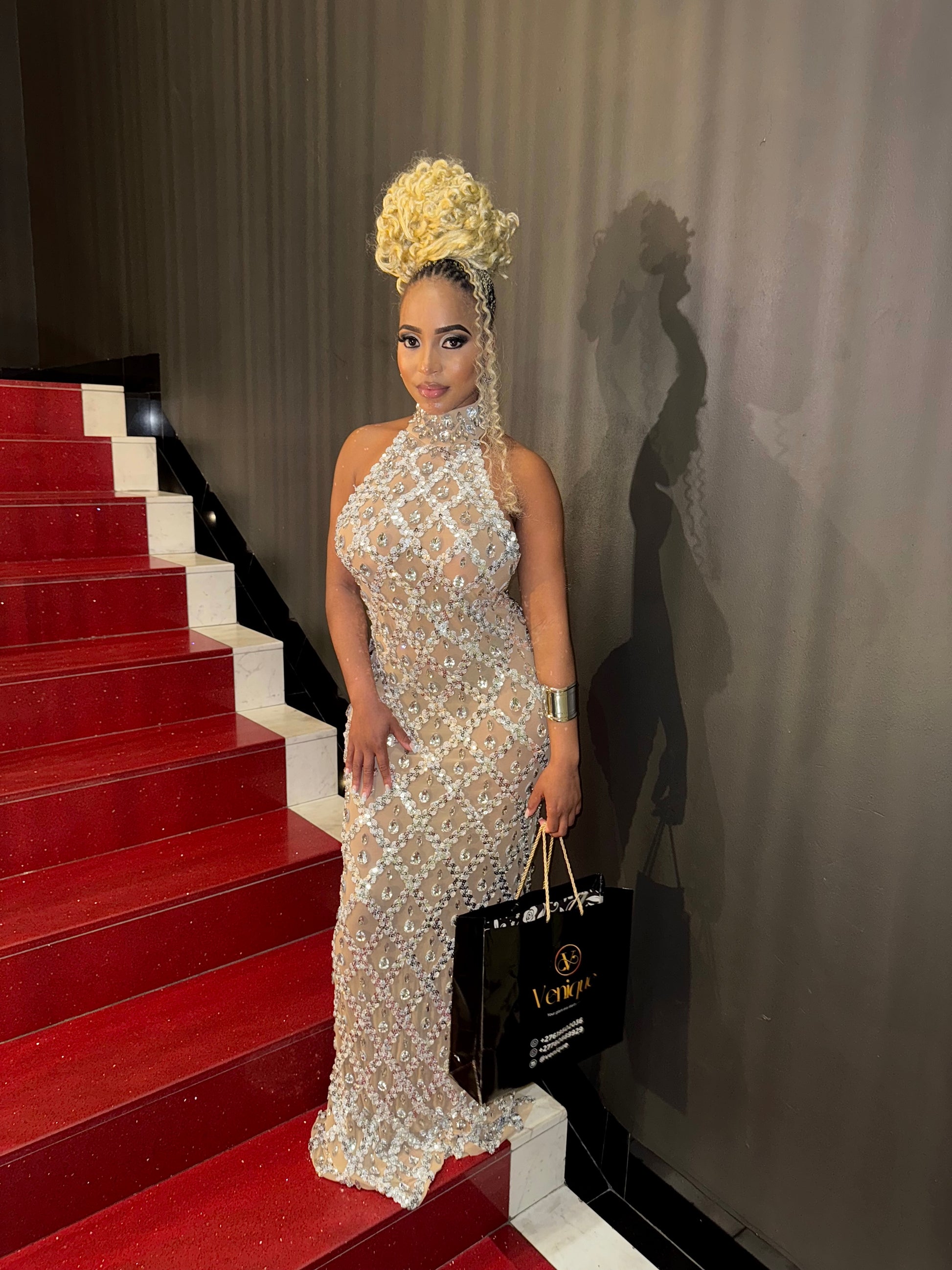 The Seraphina gown is pure elegance—crafted with a diamond crystal mesh that hugs your curves while shimmering with every step. Perfect for galas, birthdays, and glamorous nights where all eyes should be on you.