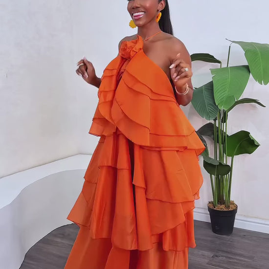 Turn every head in the room with the Valencia Ruffle Gown — a bold, statement-making dress featuring cascading ruffles and a striking one-shoulder rose detail. Perfect for luxury dinners, birthdays, and red-carpet moments.